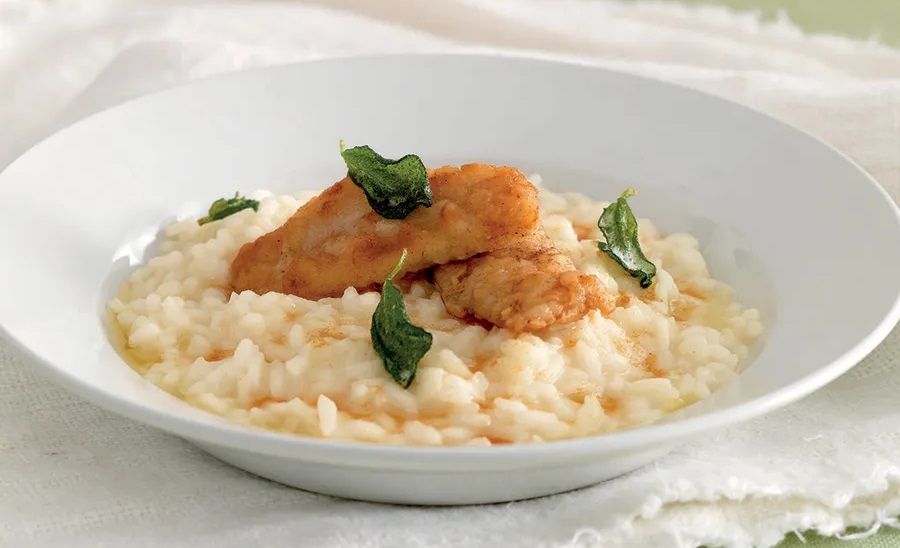 Probablemente sea así porque fusiona dos clásicos italianos: el pescado frito, en este caso la perca del lago; y un risotto clásico, con mantequilla, salvia y bien de queso Grana Padano.