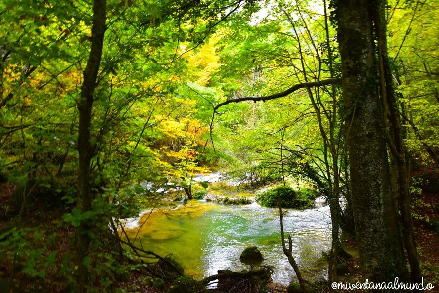 A medida que se avanza por el sendero, ese río va dando lugar a unas espectaculares pozas de agua turquesa recién salida del acuífero que hay en el interior de la pared kárstica. Son un espectáculo que os aseguramos que os dejará con la boca abierta. Sobre todo si vais en otoño, cuando el color aguamarina contrasta enormemente con los tonos dorados y rojizos de la vegetación.